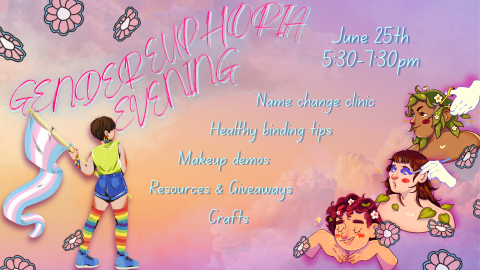 Join your trans and gender diverse siblings for an evening of gender euphoria. A name change clinic as well as resources, advice, and demos from experts to help you along whatever path you might be on to your authentic self. Not to mention crafts and snacks to keep you busy and make friends and community. True allies are welcome to this queer centered event.
