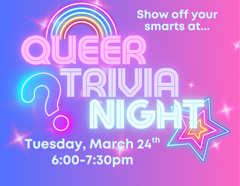 Can you ace all our LGBTQuestions? Find out at our Queer Trivia Night! We will provide pizza and drinks and test our knowledge on queer media, history, and more
