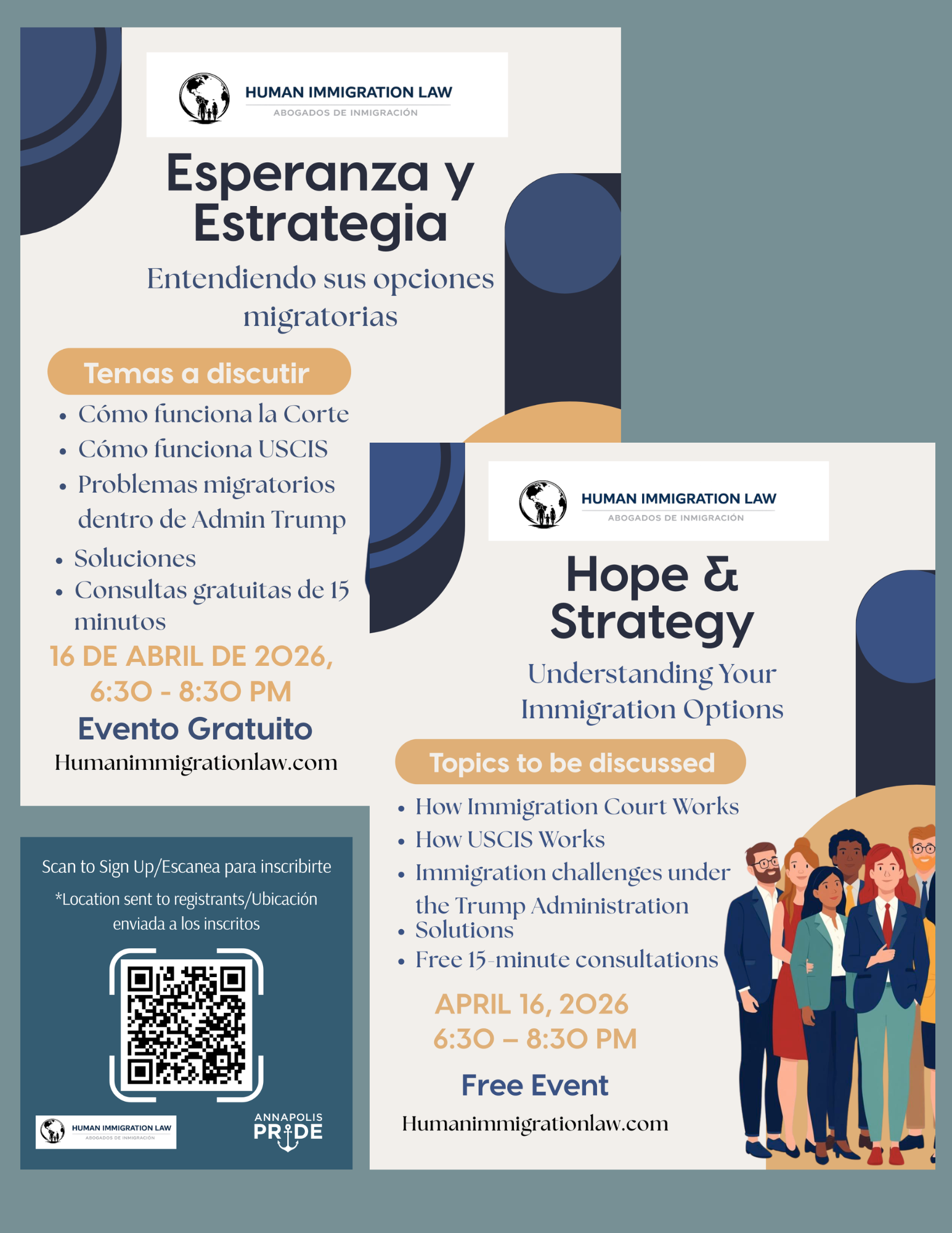 Annapolis Pride invites you to a workshop to understand your legal options for immigration and receive a FREE 15-minute consultation. The event is Free. Registrants will receive an email or a text with the location two days before the event. |